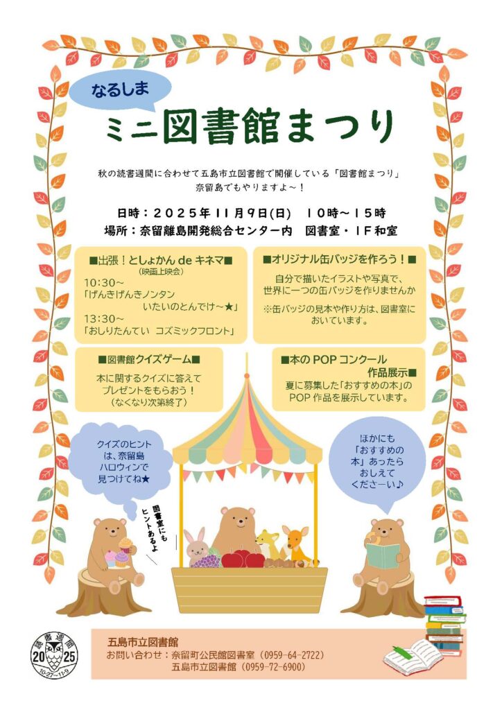 秋の読書週間に合わせて、今年は奈留でも図書館まつりを開催します。