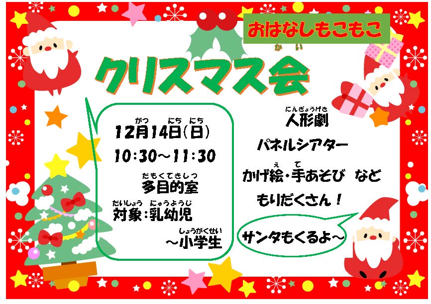 ボランティア団体のおはなしもこもこさんによる、毎年恒例のクリスマス会です。