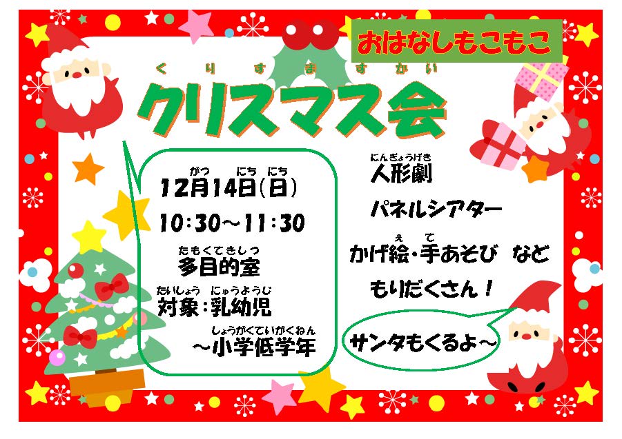 ボランティア団体のおはなしもこもこさんによる、毎年恒例のクリスマス会です。