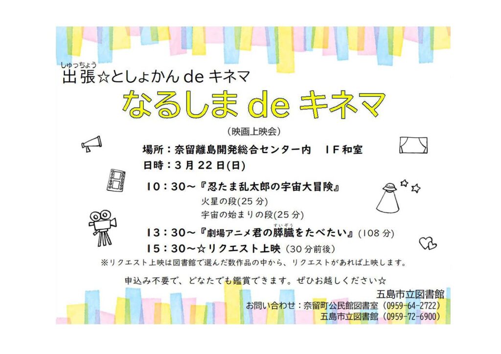 五島市立図書館で開催している「としょかんdeキネマ」を、奈留でも子ども向けに開催します!