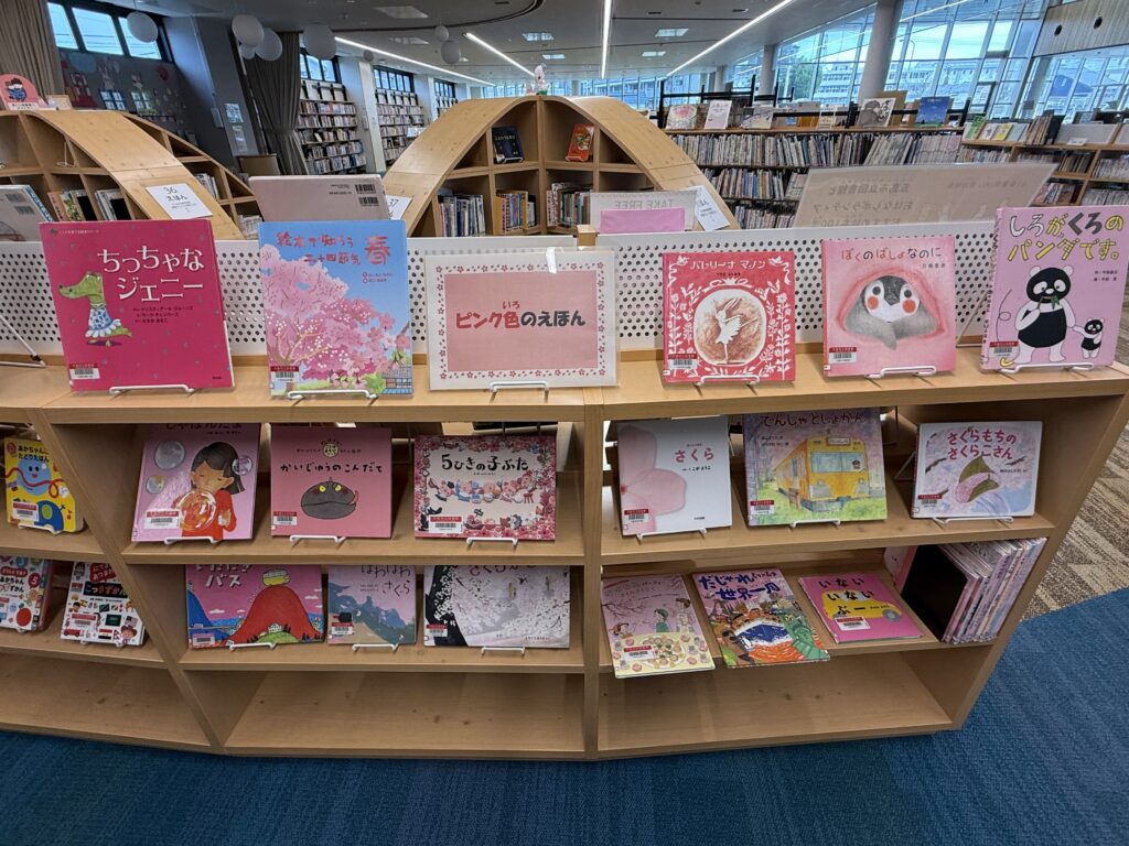 春と言えばピンク色!ということで、春らしい表紙がピンク色の絵本を展示します。